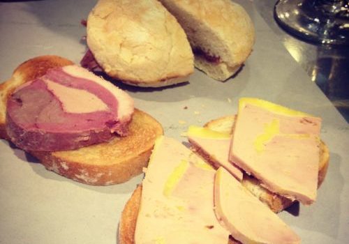 En la foto de delante hacia atrás: foie, magret de pato relleno de foie, anchoas con leche condensada. No se puede decir que sea precisamente una cena ligera, pero si te dan las tantas con hambre, estos montaditos no son mal plan.