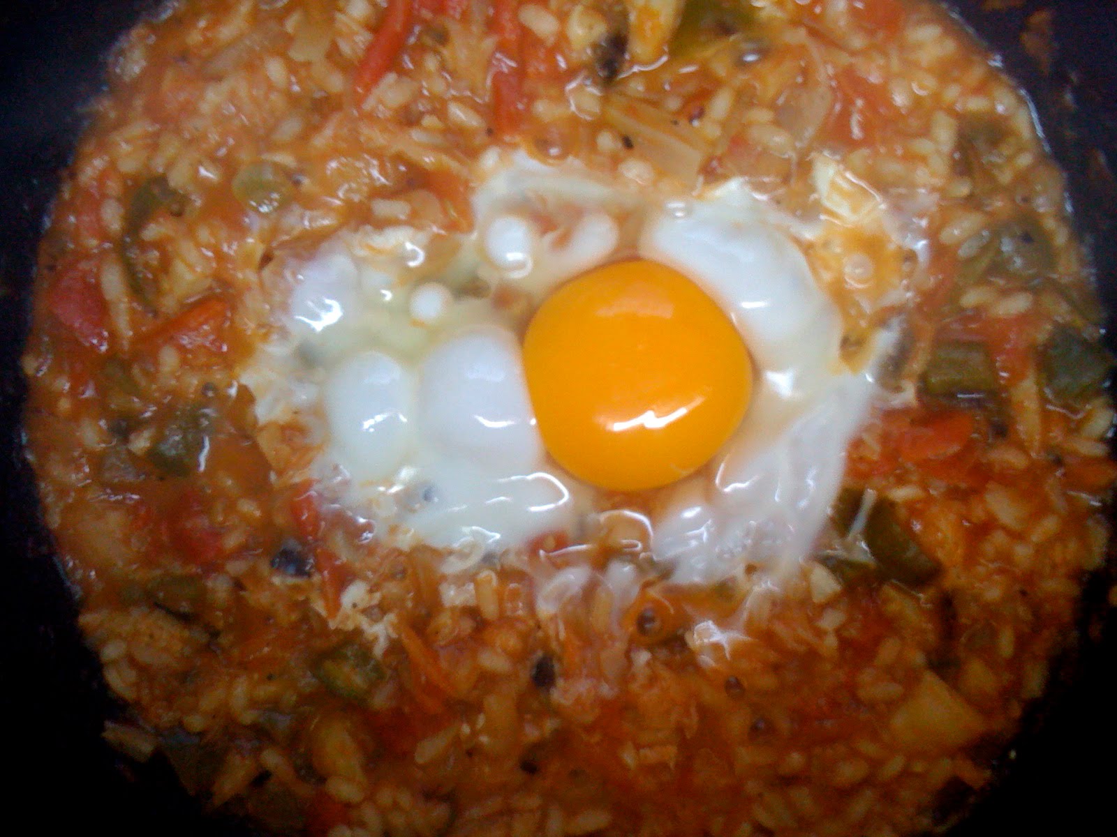 Picar las verduras en trozos más bien pequeños (yo el tomate generalmente ni lo pelo ni lo despepito). Poner a calentar el aceite en una sartén a fuego medio, añadir el ajo picado y rehogar. Cuando el ajo empiece a tener color añadir la cebolla y cuando ésta esté empezando a dorar añadir el pimiento. Rehogar un par de minutos y añadir el tomate. Salpimentar las verduras y rehogar unos minutos hasta que el tomate empiece a estar casi deshecho. Añadir el bacalao bien escurrido y rehogar ligeramente. Añadir el arroz y remover bien para que se impregne de los jugos de la sartén. Añadir dos partes de agua y dejar hervir hasta que el arroz esté casi tierno (a mí me hizo falta añadir más agua y el final en total usé casi tres partes de agua). Rectificar de sal y pimienta, poner un huevo sobre el arroz en el centro de la sartén, tapar con una tapadera y apagar el fuego (si es vitro o inducción). El arroz y el huevo se terminarán de hacer con el calor residual de la placa.