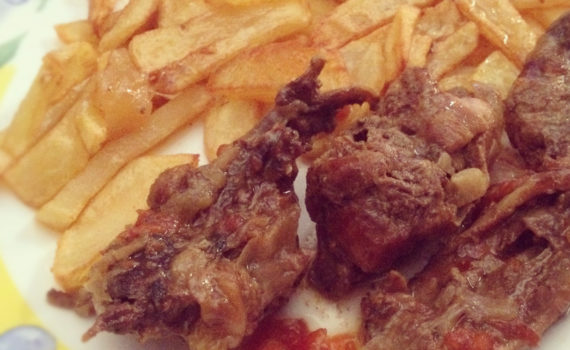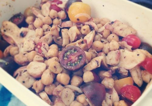 Lo que tenía a mano: pulpo, garbanzos cocidos, con mucha cebollita y tomatitos quedó rico. Todo está rico en verano en una piscina natural si le pones un buen aliño.