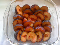 Poner las ciruelas en un recipiente para horno que sea lo suficientemente grande como para alojarlas, y bastante profundo. Espolvorearlas con 50gr de azúcar o un poco más al gusto, en este caso yo usé unos 70gr de azúcar moreno (1)