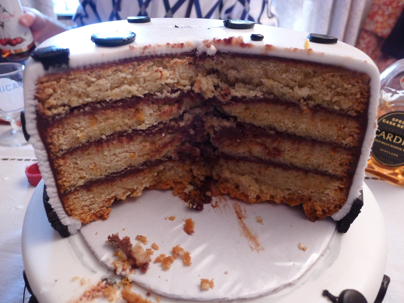 Para descongelar el bizcocho simplemente lo pasé al frigorífico la noche antes, y cuando lo saqué a temperatura ambiente le quité todo el envoltorio y lo dejé al aire. Lo corté en capas mientras todavía estaba medio congelado.