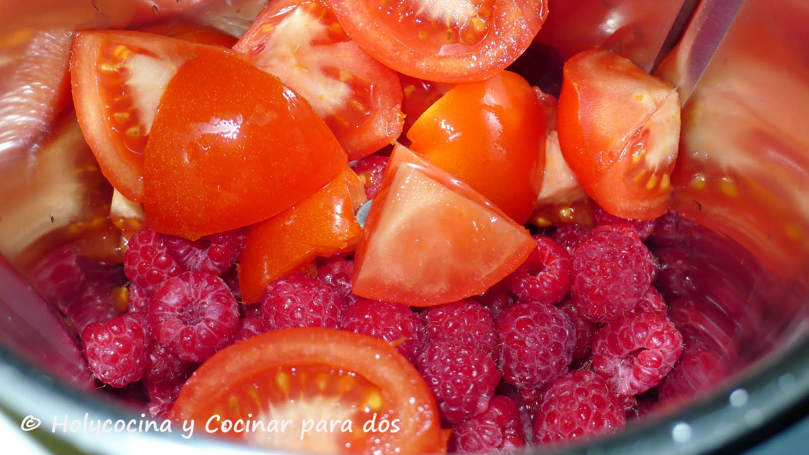 Echar las frambuesas y el tomate en el vaso de la Thermomix.