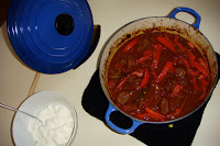 Sacar la olla del horno, dejar reposar 5 minutos, añadir la crema y remover. (Nota: no añadir la crema a la parte que se va a congelar, añadirla una vez se haya recalentado después de descongelar el goulash)