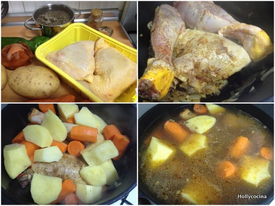 Iba a ponerle un pimiento verde pero se me olvidó, se quedó en la encimera. Las especias las suelo variar según el día, pero nunca falta el cilantro. Este pollo era campero y hubiera necesitado un poco más de tiempo para despegarse del hueso como si fuera mantequilla, pero con una hora y cuarto ya estaba suficientemente tierno y el resto de ingredientes ya no admitían más tiempo.