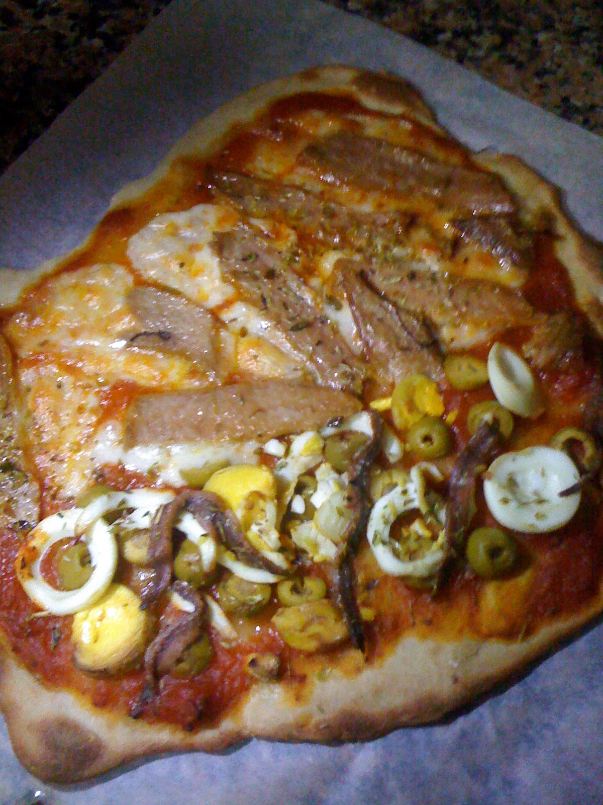 - ½ de ventresca de atún con mozarella, y ½ de anchoas con aceitunas y huevo duro.