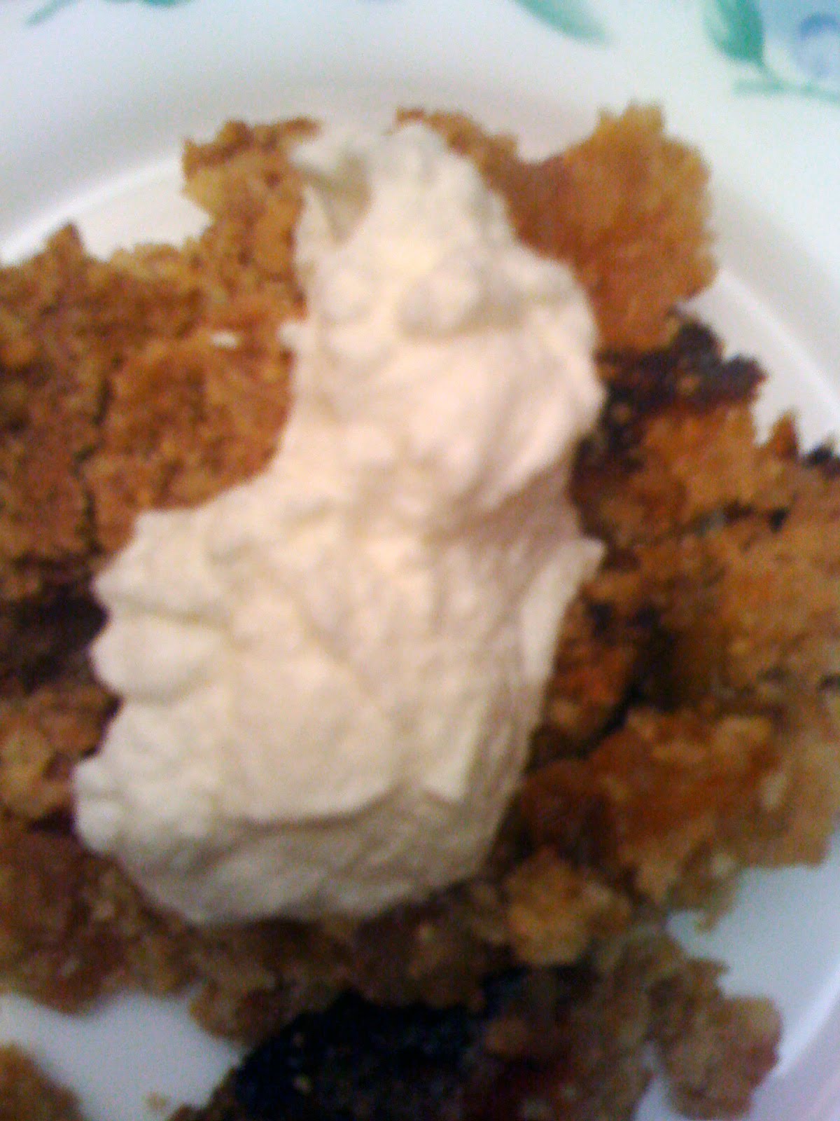 Elegí esta receta simple y llanamente porque no queíra dedicar mucho tiempo a la búsqueda y la primera que encontré para la que tenía todos los ingredientes en mi alacena fue ésta. Como a mí lo que me gusta es el crumble y la fruta es solo la excusa, multipliqué el crumble por 1,5 y también el tiempo de horneado. Ese tiempo extra le sobró a la preparación, habría estado mejor menos seco, pero aun así nos supo buenísimo con un poco de nata ligeramente montada.