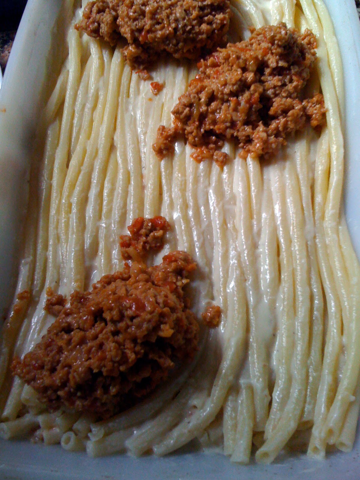 Engrasar con mantequilla una fuente para horno (a mí me gusta utilizar una rectangular que tengo muy antígua pero en la que caben los macarrones estirados enteros, pero sirve cualquier fuente). Poner sobre la fuente aproximadamente la mitad de los macarrones y ¼ parte de la bechamel, removiendo para que se integre la bechamel y dejando los macarrones siempre estirados.