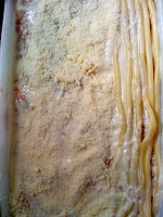 Engrasar con mantequilla una fuente para horno (a mí me gusta utilizar una rectangular que tengo muy antígua pero en la que caben los macarrones estirados enteros, pero sirve cualquier fuente). Poner sobre la fuente aproximadamente la mitad de los macarrones y ¼ parte de la bechamel, removiendo para que se integre la bechamel y dejando los macarrones siempre estirados.
