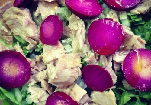Lechuga, cebolla muy picadita, una lata de ventresca de bonito, un huevo encurtido en rodajas, un poco de sal y un chorreoncito de aceite de oliva virgen extra.